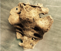 Figure 1: Anterior aspect of sacrum; arrow denotes complete fusion of L5 with S1; star denotes complete fusion of right transverse process with ala of sacrum.