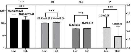 The blood test results demonstrated that the average hemoglobin (Hb) was (111.49±15.58) g/L, plasma albumin (ALB) was (38.06±4.13) g/L, parathyroid hormone (PTH) was (243.73±190.62) pg/mL, and phosphorus (P) was (1.98±0.64) mmol/L (Table 2).