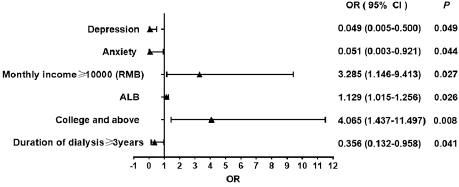 The above significantly different parameters were taken as independent variables, and score of self-management was set as dependent variables for stepwise regression analysis. The results showed that dialysis duration, monthly income, ALB, education level, anxiety, and depression were factors that influence the capacity of self-management in the MHD patients (P<0.05) (Table 1). Low income was a risk factor for poor self-management (OR=3.285, 95% CI: 1.146-9.413). The longer dialysis duration, the lower score of self-management. The risk of poor self-management in the patients underwent dialysis for shorter than three years was 0.356 times of those underwent dialysis for longer than three years (OR=0.356, 95% CI: 0.132-0.958). Furthermore, the lower education level, the poorer self-management capacity. The patients who had high school or lower education were 4.065 times risk of poor self-management compared with those had college and above education level (OR=4.065, 95% CI:1.437-11.497). The lower ALB was the risk factor of poor selfmanagement of the patients. The risk of poor self-management was decreased by 12.9% (OR=1.129, 95% CI:1.015-1.256) for each unit increase of ALB. Anxiety and depression were also the risk factors of self-management. The risk of poor self-management among patients without anxiety was 0.051 times that of patients with anxiety (OR= 0.051, 95% CI: 0.003-0.921), while the risk of poor self-management among patients without depression was 0.049 times that of patients with depression (OR=0.049, 95% CI: 0.005-0.500) (Figure 3).