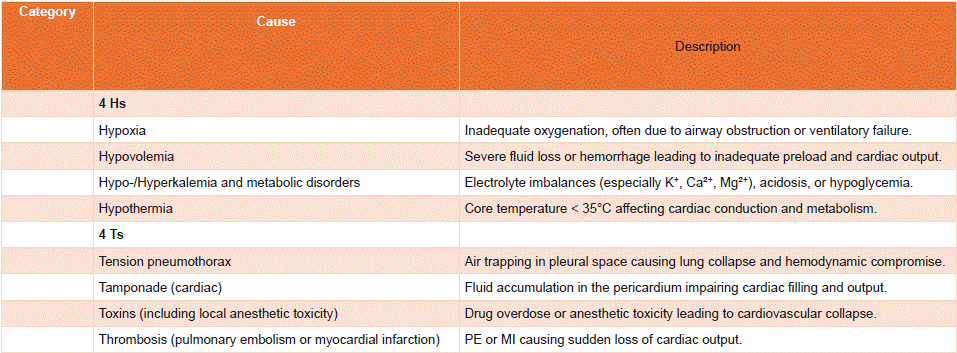 During cardiac arrest management, the diagnostic evaluation of the underlying cause must be initiated simultaneously with therapeutic interventions, particularly cardiopulmonary resuscitation. Identifying a reversible cause is fundamental and can guide specific therapeutic actions. A useful mnemonic for recalling the principal reversible causes is the "4 Hs and 4 Ts." summarized in Table 1.