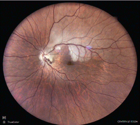Fundus photography of the left eye of a 45-year-old female patient demonstrating features consistent with a branch retinal artery occlusion (BRAO) involving the superior temporal quadrant (Figure 1). The affected retinal territory exhibits well-demarcated retinal whitening and edema, corresponding to ischemia of the inner retinal layers. The foveal region appears partially involved, causing symptomatically a decrease in visual acuity. A distinct prepapillary vascular loop is observed, originating from the optic nerve head, projecting anteriorly into the vitreous cavity, and re-entering the retinal surface before continuing as a branch artery. No associated neovascularization, hemorrhage, or optic disc edema is evident. The fundus photography of the right eye shows a same distinct prepapillary vascular loop, without arterial occulsion (Figure 2).