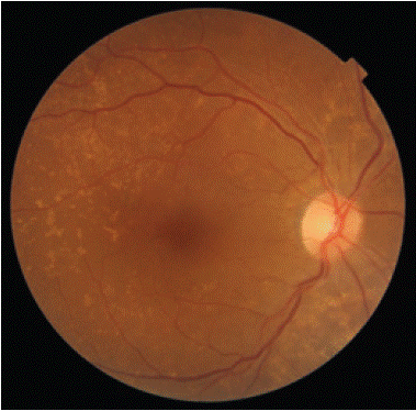 Figure 1: Fundus right eye: multiple yellowish-white flecks, predominantly pisciform but with a few round ones, distributed in the macular region.