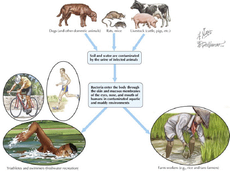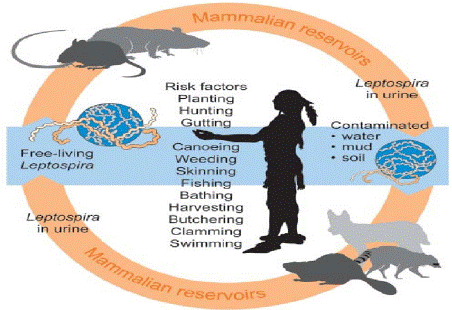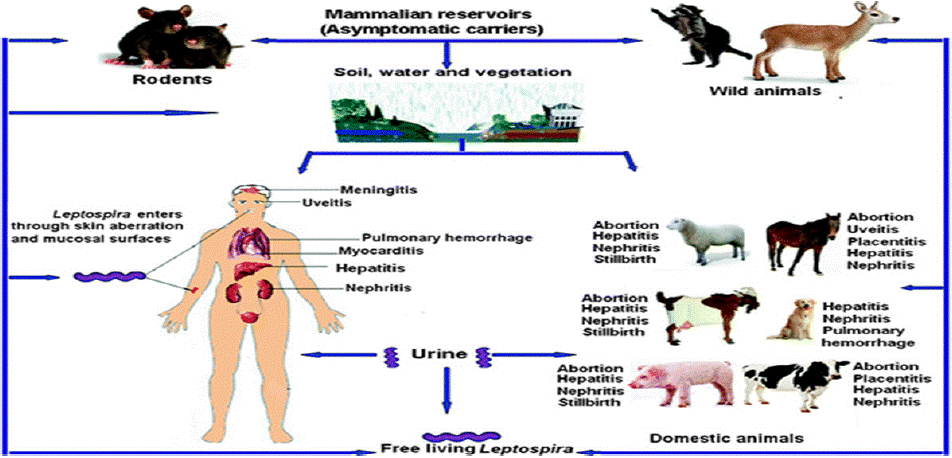 When pathogenic Leptospira persist for up to many months under favorable conditions, they are expelled by the urine into the environment from the kidneys of natural hosts, primarily animals. Like, exposure to diseased animals, their urine, or an environment polluted by their pee (most commonly dirt and water) can cause infection. The mucous membranes and exposed skin are the contamination routes. A huge number of sylvatic and domestic animals serve as the reservoir of Leptospira, and leptospirosis is typically diagnosed in various animal types. There are more than 200 known L. interrogans human infections. Leptospirosis is caused by pathogenic serovars and is spread through a number of different mechanisms [5].