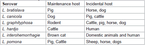 A maintenance or reservoir host is an animal that has been infected with a serovar of the pathogen that is suited to its host. Each serovar is adapted to a particular maintenance host, although they may cause disease in any mammalian species. A serovar behaves differently within its maintenance host species and incidental or accidental hosts [33]. The disease is maintained in nature by chronic infection of the renal tubules of these maintenance hosts [9].