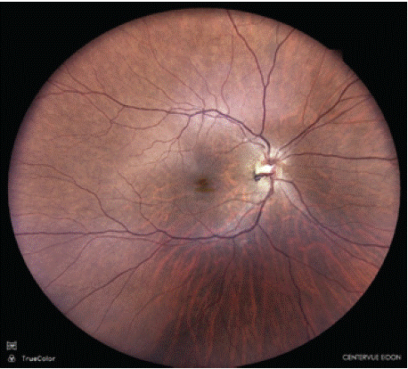 Fundus photography of the left eye of a 45-year-old female patient demonstrating features consistent with a branch retinal artery occlusion (BRAO) involving the superior temporal quadrant (Figure 1). The affected retinal territory exhibits well-demarcated retinal whitening and edema, corresponding to ischemia of the inner retinal layers. The foveal region appears partially involved, causing symptomatically a decrease in visual acuity. A distinct prepapillary vascular loop is observed, originating from the optic nerve head, projecting anteriorly into the vitreous cavity, and re-entering the retinal surface before continuing as a branch artery. No associated neovascularization, hemorrhage, or optic disc edema is evident. The fundus photography of the right eye shows a same distinct prepapillary vascular loop, without arterial occulsion (Figure 2).