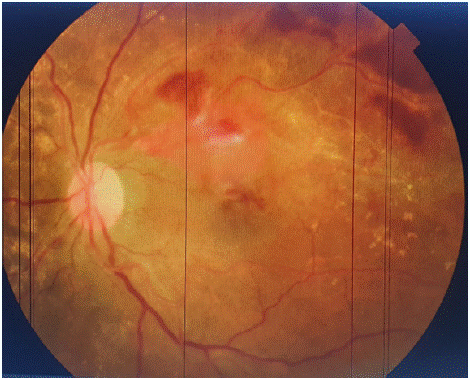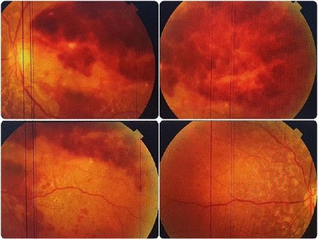 Figure 6: Fundus exam: partial hemorrhagic resorption.