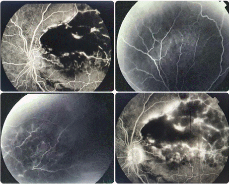 Autofluoroscence imaging revealed multiple hyperautofluorescent lesions (44 of the hemorrhagic zone) corresponding to the flecks. Fluorescein angiography of the LE showed hypofluorescence caused by decreased transmission due to the presence of hemorrhage and superior hyperfluorescence with leakage possibly indicating neovascularization. In the RE, hyperfluorescence focally at the fleck sites corresponded to pigment epithelial changes (Figure 3).