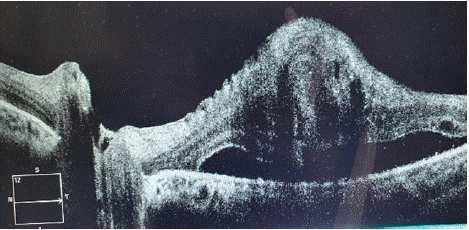 Figure 4: The spectral domain OCT (SD-OCT) of the right eye did show juxtafoveal CNV with associated subretinal fluid and hyperreflective dots.