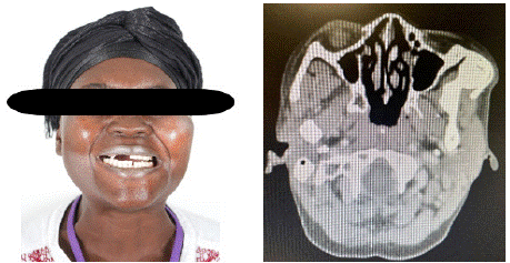 A 43-year-old female patient presented in Freetown/Sierra Leone on board the hospital ship “Global Mercy” of the American NGO “Mercy Ships” with a suspected diagnosis of left temporomandibular joint ankylosis. A clinical examination revealed a restricted mouth opening of no more than 5 mm and some minor facial asymmetry of the left zygoma (Figure 1a). On inquiry, it was reported that the mouth-opening restriction had been present for about ten years. The enlargement of the left coronoid process but was inconclusive. Further CT diagnostics revealed a well-defined radiopaque lesion between the left zygomatic bone and the coronoid process caused by a large bony tumor instead of a true left temporomandibular joint ankylosis (Figure 1b). Based on clinical presentation and preoperative radiologic features, a provisional diagnosis of coronoid osteoma was established.