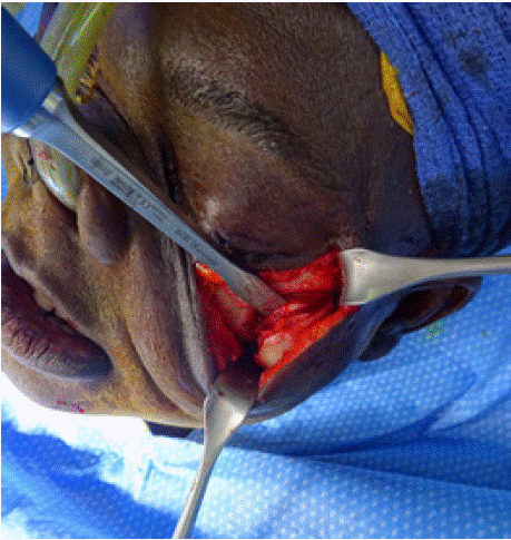Figure 2: Surgical access to the left zygoma using subciliar incision with lateral extension.
