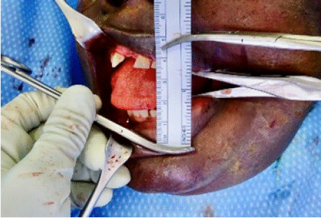 Figure 3: Immediate intraoperative mouth opening after left coronoidectomy using combined intra-/extraoral approach.