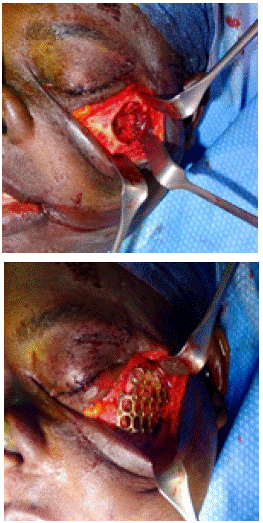 Figure 4a, b: Bony mass results in a limited bony defect of the left outer cortical plate of the zygoma (4a). A titanium mesh was used to cover the bony defect of the left zygoma (4b).