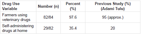 Among Farmers out of 84 farmers interviewed, 82 (97.6%) reported using veterinary drugs. Among these, 29 (35%) selfadministered drugs at home without professional consultation, representing a 75% increase compared to 20% reported in the Adami Tulu district [1] (Table 1).