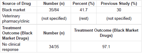Drug sourcing from the black market was reported by 35 (42%) farmers, significantly higher than the 30% previously documented. A striking 96% of these farmers reported no clinical response following treatment with black market drugs. Drugs obtained from veterinary pharmacies and clinics were reported ineffective by 18% and 22% of farmers, respectively (Table 2). Statistical analysis confirmed a strong association between drug source and treatment success (Χ² = 45.789, P < 0.001).