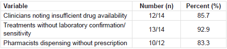 Among 14 clinicians interviewed, 85% reported insufficient drug availability, and 95% acknowledged that laboratory diagnostics and drug sensitivity testing were rarely performed before treatment. Additionally, 28% reported treating animals based on farmer demands rather than professional judgment (Table 3).