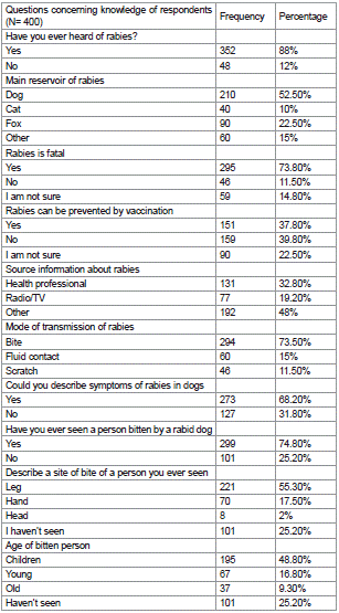 The study was conducted in Legehida woreda, Bale zone, from March 2019 to November 2019, to assess the knowledge, attitude, and practice of the community toward rabies using a community-based cross-sectional study supported by a semi-structured questionnaire survey. Legehida woreda was selected purposely and kebeles were selected using the lottery method, while the households were selected using a systematic random sampling technique. Of the 400 people interviewed, 70% were males and 30% of them were females. The age groups between 18-30 years were accounted for the highest proportion (50%) of all age categories, where the majority of respondents were illiterate (37.5%) and Muslims were accounted for the highest number (62.5%) among their religion. The majority of participants (88%) had been heard of rabies previously and 52.5% of them knew dogs as the reservoir of rabies. The highest percentages (48%) of them were informed about rabies from several sources and 73.8% knew that rabies is a fatal disease, 39.8% of them were not aware of rabies prevention through vaccination. Statistically, significant difference was revealed between some key questions related to KAP and explanatory variables like sex (P<0.001), age (P<0.001) levels of education (P<0.001), and religion (P<0.001) of respondents. Generally, the people in this area were a little bit known about rabies; however, they had a negative attitude and practice about rabies. Therefore, an outreach health education should be conveyed to ensure accurate knowledge, to improve an attitude and practice about rabies in this area.